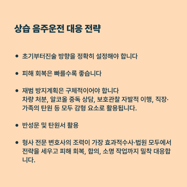 상습 음주운전은 초범보다 훨씬 엄격한 기준으로 판단받습니다. 그러나 빠른 인정·적극적인 피해 회복·재범 방지 노력·정확한 법률 대응이 마련된다면 집행유예나 감형의 가능성을 열 수 있습니다.