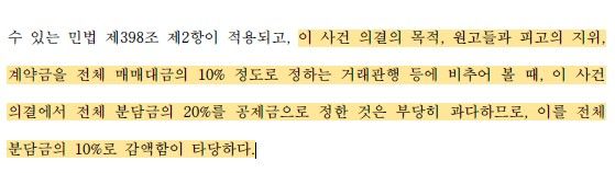 이때 위약금 비율을 예전에는 10% 정도로 하다가, 최근에는 20%로 높이는 추세였는데요.조합원들 입장에서는 위약금 20%가 너무 과하다고 생각하실 수 있고, 조합은 그 동안의 사업 진행 과정에서 지출된 경비와 새롭게 다시 대체조합원을 모집하는데 드는 비용 등을 고려할 때 20%는 과하지 않다는 입장이어서, 그 동안 위약금 액수에 대한 분쟁이 빈번하였고 하급심에 따라 그 비율이 달리 판단되어 왔습니다.