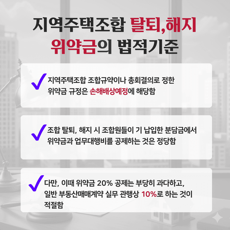 지역주택조합 사업의 특성상 사업 지연이나 무산 위험으로 조합원 탈퇴가 빈번한데, 이때 탈퇴, 해지 등을 주장하는 조합원들과 분쟁을 줄이고자 조합에서는 조합규약이나 총회 의결로 위약금을 명시적으로 정하는 경우가 많습니다.