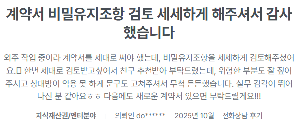 경험 있는 변호사와의 1:1 계약서 검토만으로도 불리한 조항을 사전에 제거하거나, 향후 분쟁을 예방할 수 있는 근거를 마련할 수 있습니다.