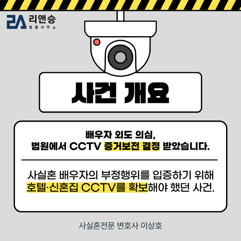 이에 법원 절차를 이용해 호텔 CCTV 영상, 상대방이 출입한 신혼집 CCTV 영상을 확보하기 위해 “증거보전신청”을 진행하게 된 사건입니다.