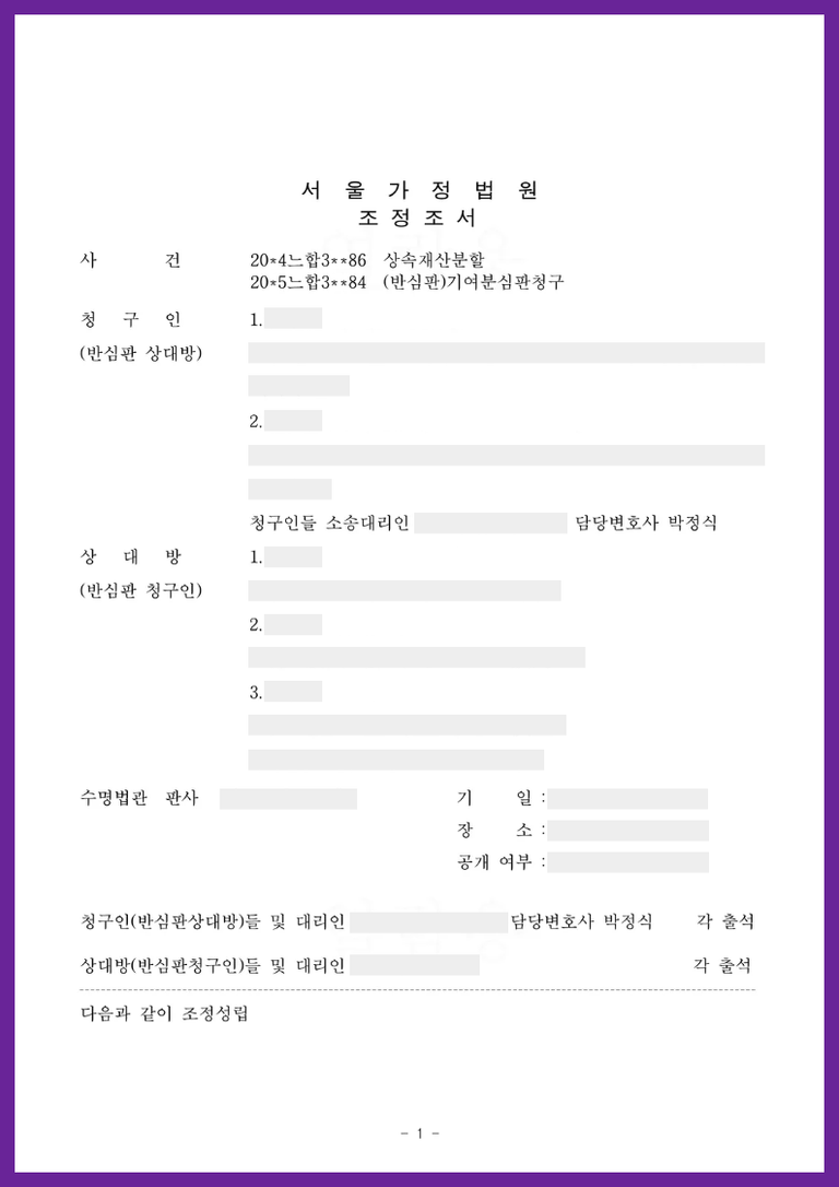 청구인들의 특별수익 주장과 상대방들의 기여분 주장에 대해서 일부 인정하면서, 청구인들과 상대방들은 향후 서로에 대하여 피상속인의 상속재산과 관련된 민사, 형사, 가사 등 일체의 청구(유류분 청구 포함)를 하지 않는 내용으로 조정을 권유하였고, 이에 대해서 청구인과 상대방들은 모두 재판부의 조정을 받아들여 원만히 조정이 성립되었습니다. 이 사건은 특별수익과 기여분이 모두 주장되는 복잡한 상속분쟁에서, 법원이 조정을 통해 양측의 주장을 종합적으로 고려하여 실질적 공평을 도모한 사례로서 의의가 있습니다.