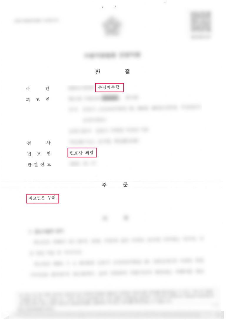 결국 법원은 준강제추행 혐의에 대하여 무죄를 선고했습니다.