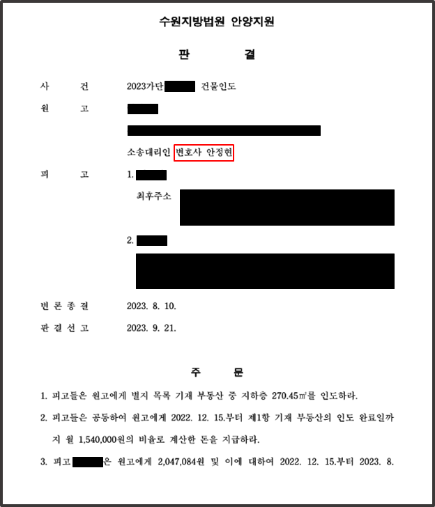 임대차계약 상 다소 특이한 점은 임대차계약서 명의상 임차인과 실제로 영업을 하며 점유 중인 사람이 다른 사람이었다는 점입니다. 따라서 피고를 두 사람으로 특정하여 인도집행에 문제가 없도록 했고, 금전집행에 있어서도 실효성이 생길 수 있도록 대처하였습니다.