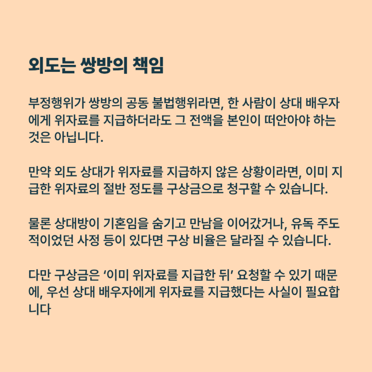 다만 구상금은 ‘이미 위자료를 지급한 뒤’ 요청할 수 있기 때문에, 우선 상대 배우자에게 위자료를 지급했다는 사실이 필요합니다.