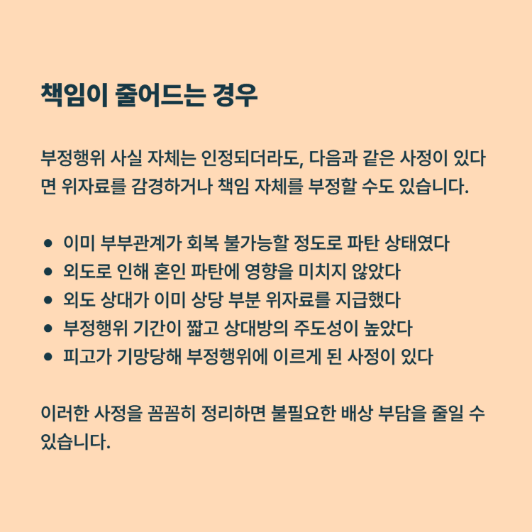 부정행위 사실 자체는 인정되더라도, 다음과 같은 사정이 있다면 위자료를 감경하거나 책임 자체를 부정할 수도 있습니다.