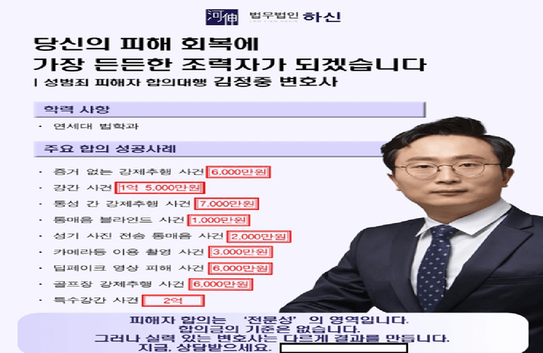 안녕하세요. 성범죄 피해자 대리 전문 김정중 변호사입니다.