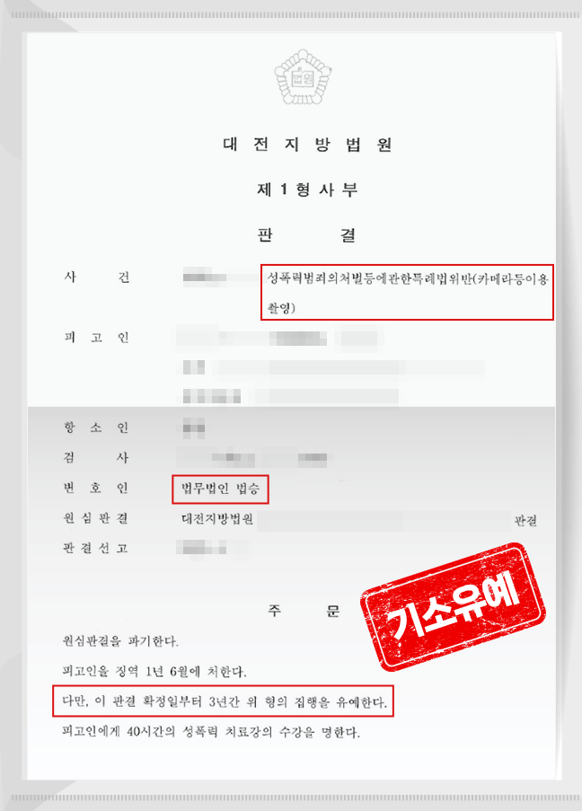 저 정진구 청주형사사건전문변호사는 집행 유예 판결을 이끌어 내며 K가 교도소에서 석방될 수 있도록 조력했습니다. 실형이라는 성폭력범죄처벌 위기 속에서 성공적인 선처를 안겨 드린 겁니다.