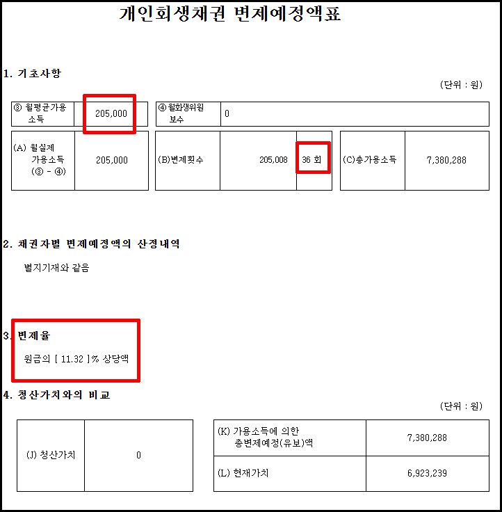그럼에도 최종 결정은 월 205,000원 × 36개월(총 약 740만 원)만 변제.