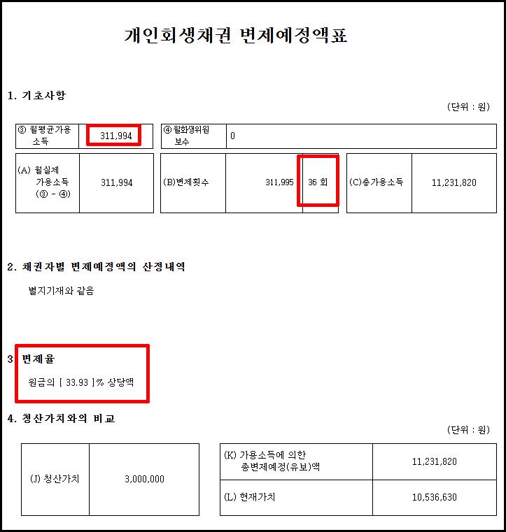 법원은 최종적으로 월 31만 원 × 36개월, 약 1,120만 원만 변제하도록 결정했고,