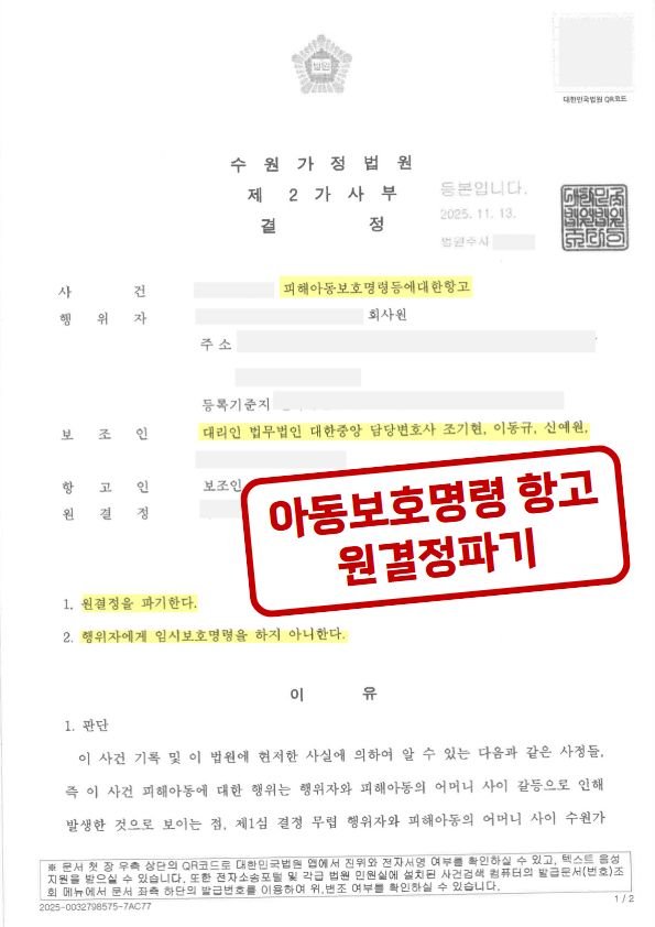 조기현 변호사는 아동보호명령에 대한 항고를 제기하여, 해당 행위는 아내와의 갈등으로 인해 발생한 것이며 이후 매우 후회하고 학대행위를 더이상 하지 않은 점, 문제 개선을 위해 노력하고 있는 점 등을 입증하였습니다.