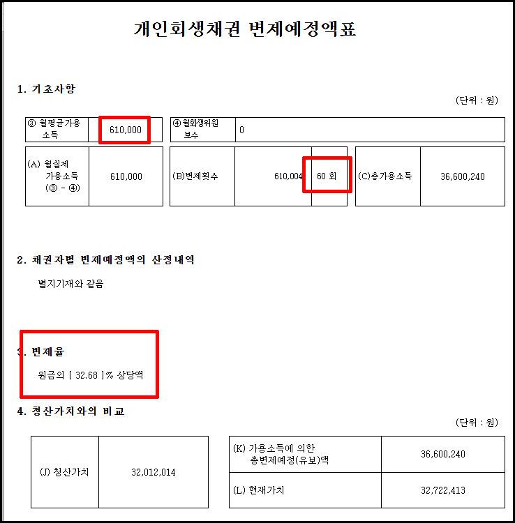 그러나 의뢰인의 소득(월 158만 원)으로는 36개월 × 변제금만으로는 청산가치를 채울 수 없는 구조였습니다.