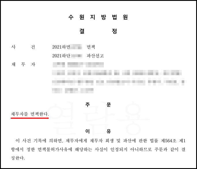 결론적으로 법원은 파산선고 → 면책결정을 차례로 내렸습니다. 1억 원이 넘는 이자 포함 채무 전액이 모두 소멸되었습니다.