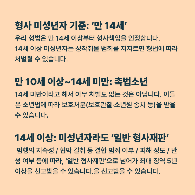 14세 미만이라고 해서 아무 처벌도 없는 것은 아닙니다. 이들은 소년법에 따라 보호처분(보호관찰·소년원 송치 등)을 받을 수 있습니다.