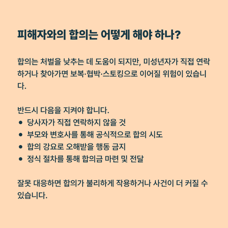 합의는 처벌을 낮추는 데 도움이 되지만, 미성년자가 직접 연락하거나 찾아가면 보복·협박·스토킹으로 이어질 위험이 있습니다.