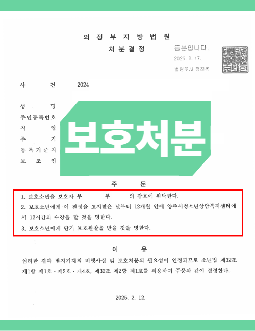 그 결과, 일반 형사재판으로 넘어갈 사안이었음에도 불구하고, 재판부는 소년보호재판으로 방향을 바꾸었고, A군은 1·2·3호 보호처분을 받으며 소년원 송치라는 최악의 결과를 피할 수 있었습니다.