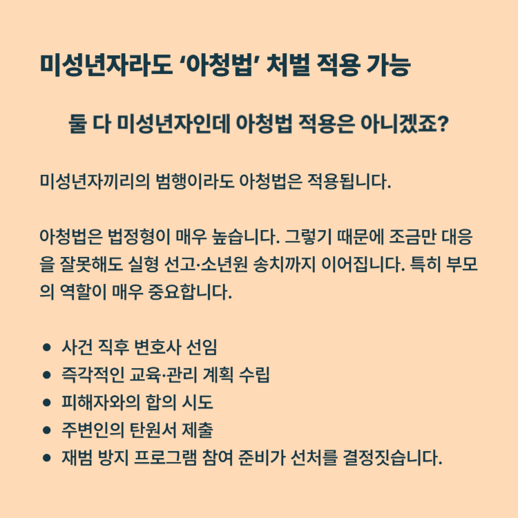 아청법은 법정형이 매우 높습니다. 그렇기 때문에 조금만 대응을 잘못해도 실형 선고·소년원 송치까지 이어집니다. 특히 부모의 역할이 매우 중요합니다.