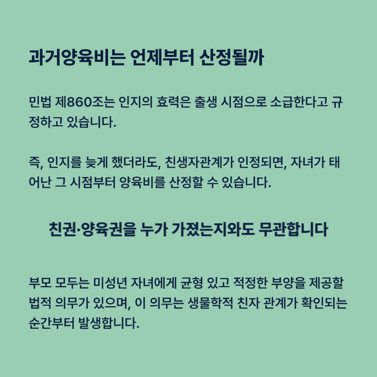 즉, 인지를 늦게 했더라도, 친생자관계가 인정되면, 자녀가 태어난 그 시점부터 양육비를 산정할 수 있습니다.