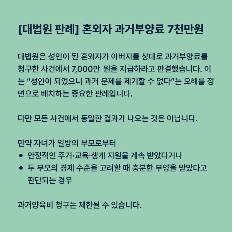 대법원은 성인이 된 혼외자가 아버지를 상대로 과거부양료를 청구한 사건에서 7,000만 원을 지급하라고 판결했습니다. 이는 “성인이 되었으니 과거 문제를 제기할 수 없다”는 오해를 정면으로 배치하는 중요한 판례입니다.