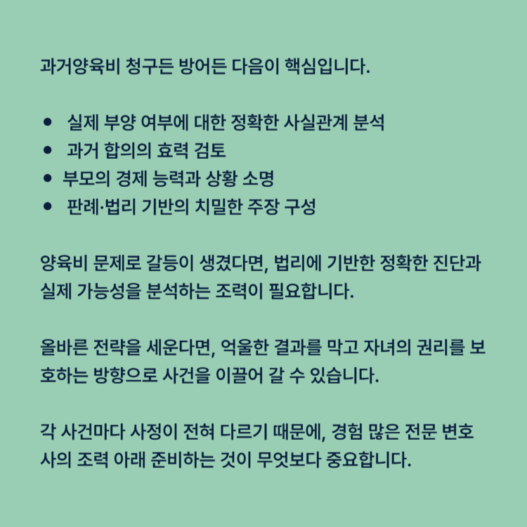 양육비 문제로 갈등이 생겼다면, 법리에 기반한 정확한 진단과 실제 가능성을 분석하는 조력이 필요합니다. 올바른 전략을 세운다면, 억울한 결과를 막고 자녀의 권리를 보호하는 방향으로 사건을 이끌어 갈 수 있습니다.