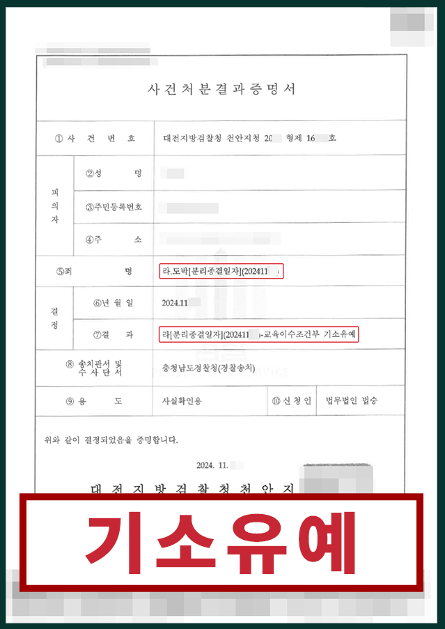 결국, 의뢰인은 수사기관으로부터 전과가 남지 않는 기소유예 처분을 받음으로써 무사히 가정과 직장에 다시 복귀할 수 있게 되었습니다.