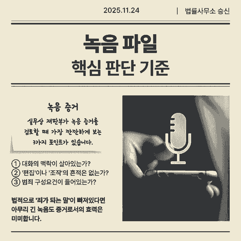 실무상 재판부가 녹음 증거를 검토할 때 가장 깐깐하게 보는 3가지 포인트가 있습니다.