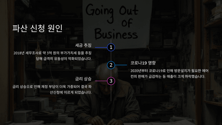 설상가상으로 2020년경부터 코로나19로 방문설치가 필요한 에어컨의 판매가 급감하는 등 매출이 크게 하락하였고 금리마저 오르게 되어 파산신청에 이르게 되었다.