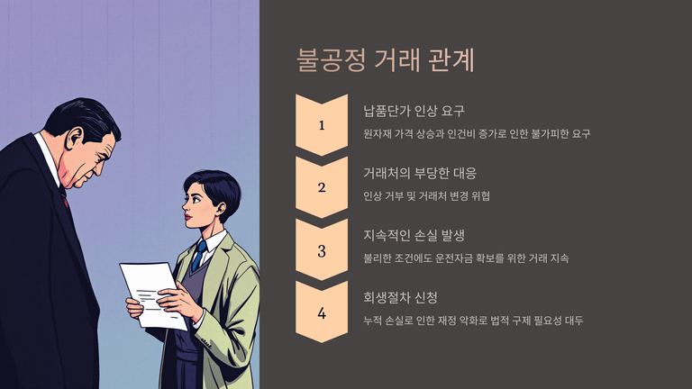 이러한 생활용품 판매점의 부당한 통보에도 불구하고, 채무자회사는 당장 필요한 운전자금의 확보를 위하여 주거래처인 생활용품 판매점에 물품을 공급할 수 밖에 없었고, 이로 인하여 거래를 할수록 채무자회사의 손해는 급증하였다.