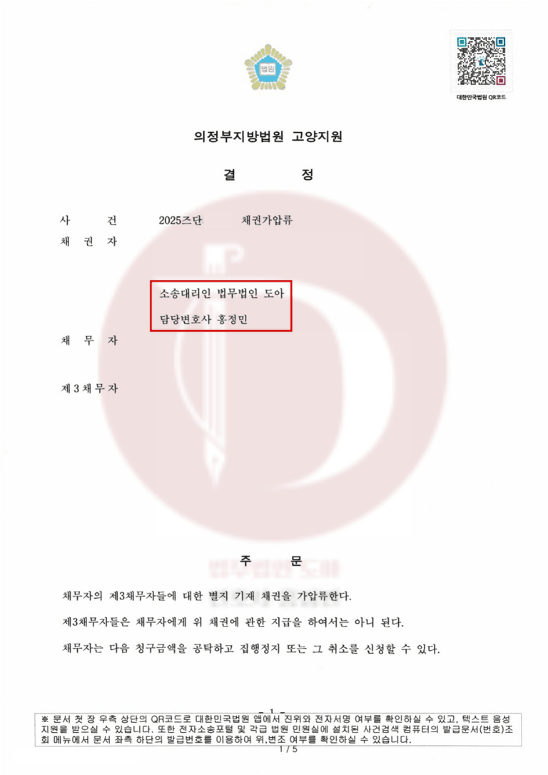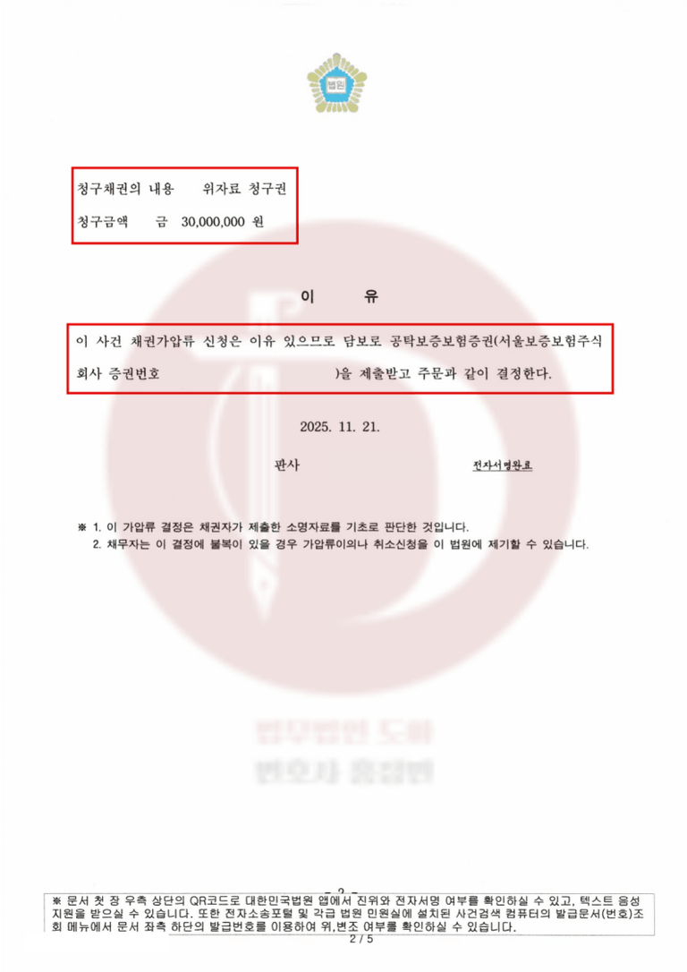 이번 성공 사례는 의뢰인은 소액의 보험료만 납부하고, 소중한 현금 자산을 묶어두지 않은 채 즉시 가압류 집행을 완료할 수 있었습니다.