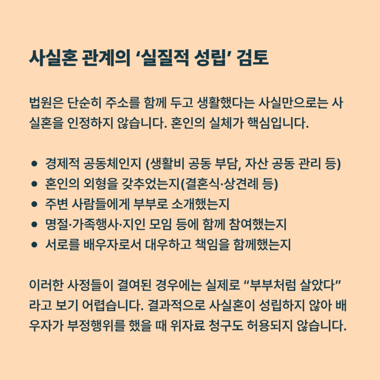 이러한 사정들이 결여된 경우에는 실제로 “부부처럼 살았다”라고 보기 어렵기 때문에, 결과적으로 사실혼 자체가 성립하지 않아 상간 위자료 청구도 허용되지 않습니다.