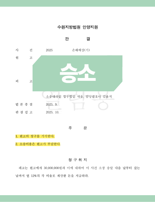 법원은 청구 전체 기각, 소송비용 전부 B씨 부담 이라는 강한 판단을 내렸습니다. 의뢰인 A씨는 억울한 재배상 없이 사건을 마무리할 수 있었습니다.