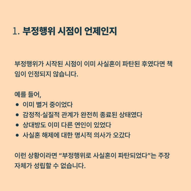 이런 상황이라면 “부정행위로 사실혼이 파탄되었다”는 주장 자체가 성립할 수 없습니다.