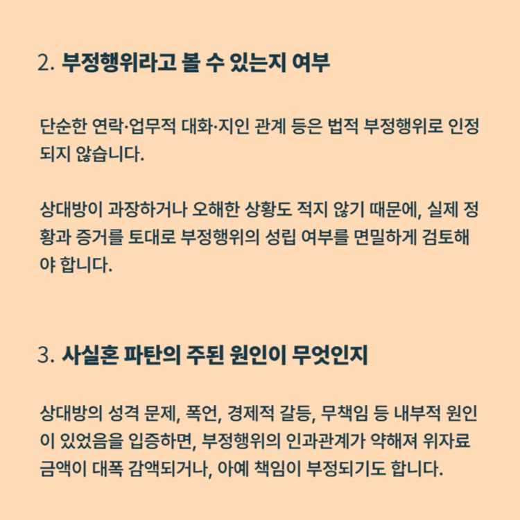 단순한 연락·업무적 대화·지인 관계 등은 법적 부정행위로 인정되지 않습니다. 상대방이 과장하거나 오해한 상황도 적지 않기 때문에, 실제 정황과 증거를 토대로 부정행위의 성립 여부를 면밀하게 검토해야 합니다.