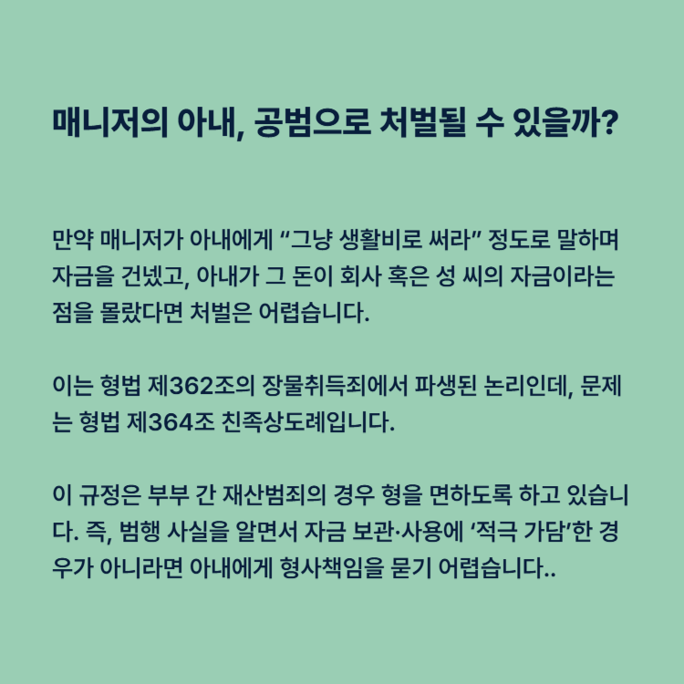 만약 매니저가 아내에게 “그냥 생활비로 써라” 정도로 말하며 자금을 건넸고, 아내가 그 돈이 회사 혹은 성 씨의 자금이라는 점을 몰랐다면 처벌은 어렵습니다.