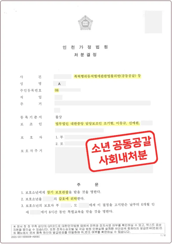 그 결과 재판부는 이동규 변호사의 주장을 인정하고, 사회내에서 소년을 보호하도록 하는 5,6호 처분을 내렸습니다.