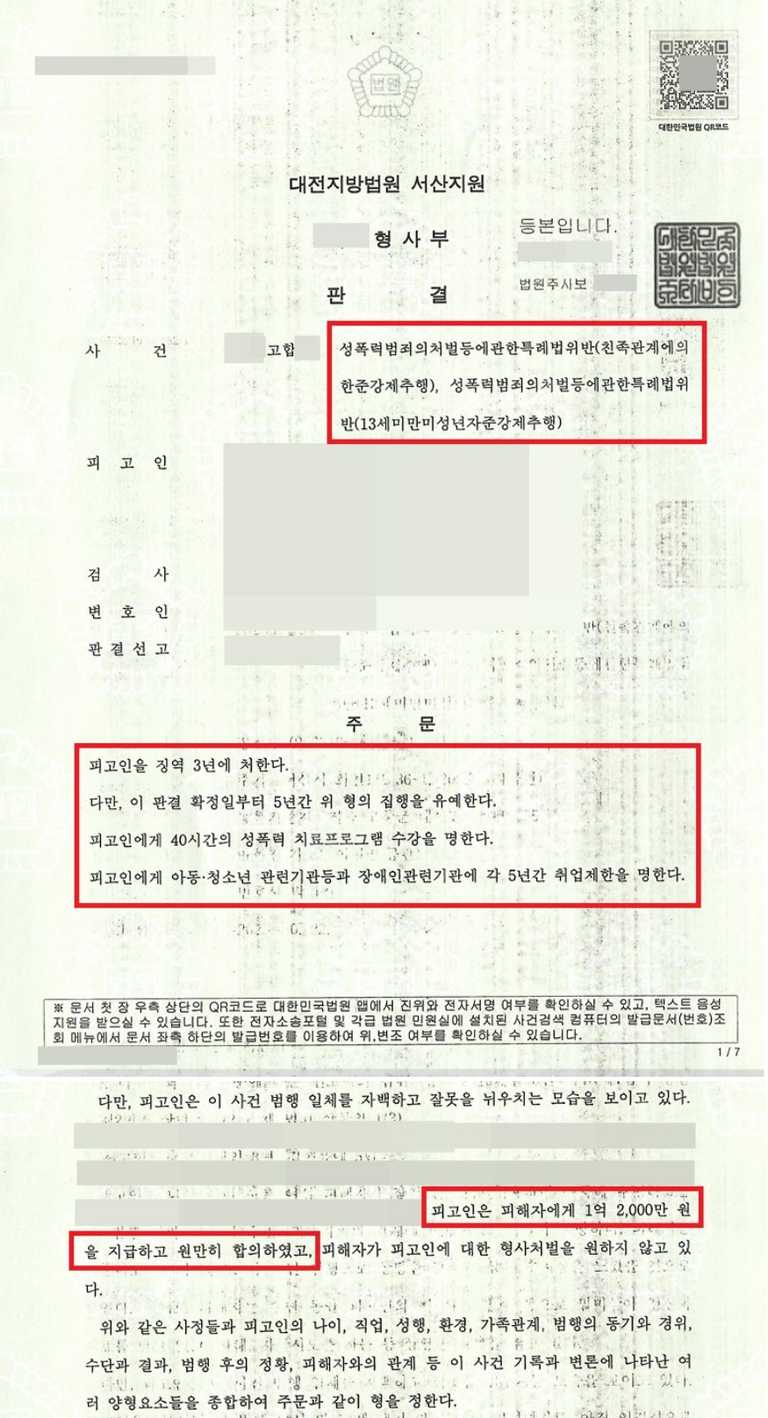 이번 포스팅은 제가 담당했던 사건 중 의뢰인이 사촌오빠를 피고소인으로 하여 성폭력범죄의처벌등에관한특례법위반(친족관계에의한준강제추행, 13세미만미성년자준강제추행)으로 고소하였고, 피고소인은 징역3년에 집행유예5년, 취업제한5년 등이 선고되었으며, 의뢰인은 합의 조율을 통해 위자료로 1억 2000만 원을 지급받은 성공사례입니다.