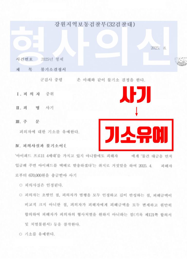 32검찰대 군검사는 법률사무소 유(唯)의 형사전문변호사의 주장 및 제출한 양형사유를 받아들여 범행 사실은 인정되나, 의뢰인이 자신의 잘못을 모두 인정하며 깊이 반성하고 있는 점, 범행이 1회에 그쳤고 피해금액이 비교적 크지 않은 점, 피해자와 원만히 합의한 점 등을 이유로 기소유예 처분을 하였습니다.
