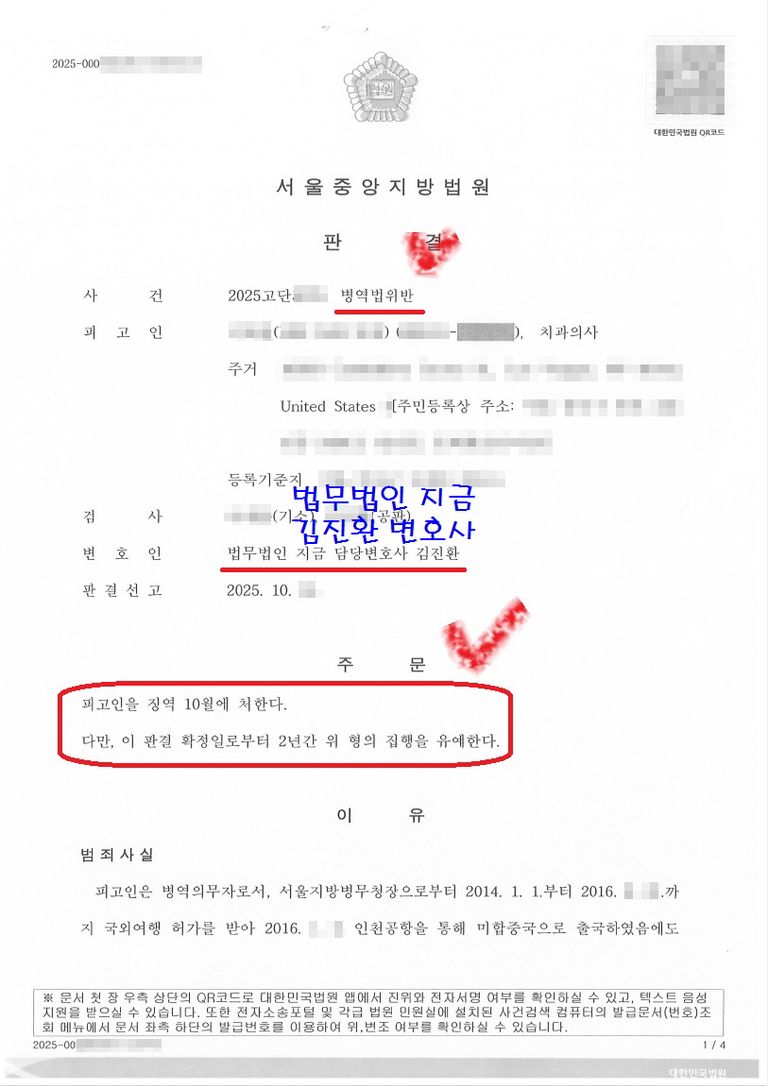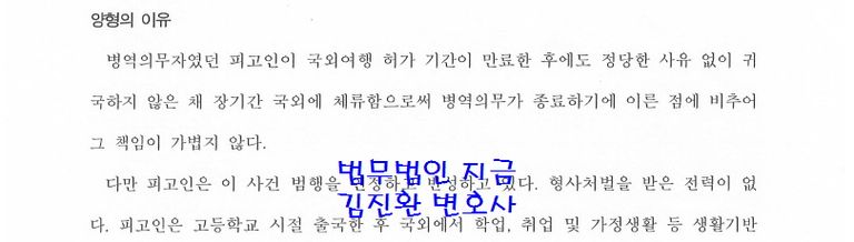 그리고 이번 의뢰인분은 재판에 회부된 후 변호사를 선임하셨지만 조사 단계에서 미리 선임한다면 재판까지 가지 않고 검찰 단계에서 기소유예로 종료될 수도 있으니 귀국 전에 병역법 전문 변호사를 알아보시는 것도 괜찮을 것입니다.