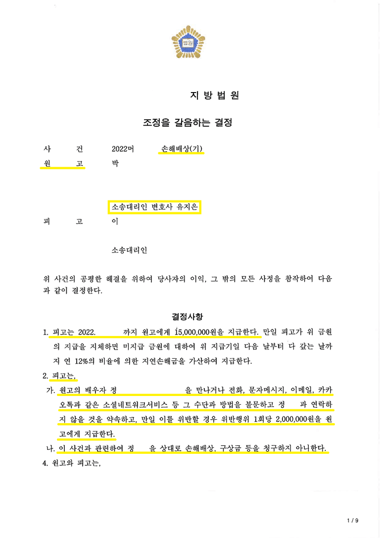 결국, 상간녀가 남편에게 구상금을 청구하지 아니하는 조건으로 상간녀로부터 위자료로 1,500만 원을 지급받고, 상간녀가 남편에게 연락할 경우 각 위반행위 1회당 200만 원씩을 지급하는 내용의 강제조정 결정을 받을 수 있었습니다.