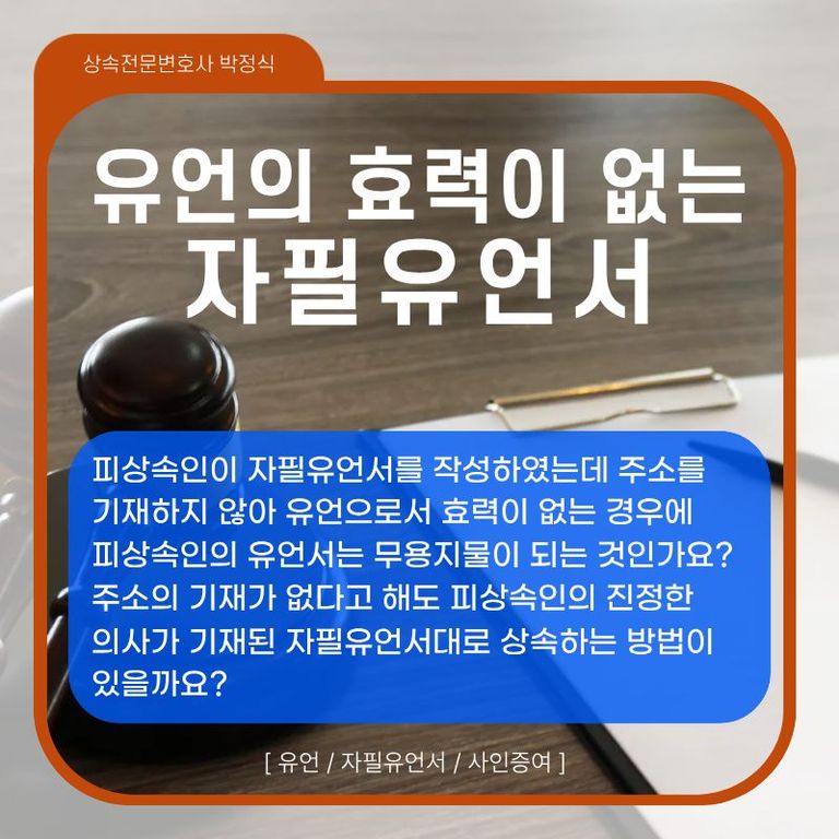 오늘은 피상속인이 직접 작성한 자필유언서에 피상속인의 주소가 기재되어 있지 않아 적법한 유언으로 인정될 수 없는 경우 이를 사인증여로 볼 수 있는지에 대하여 알아보도록 하겠습니다.