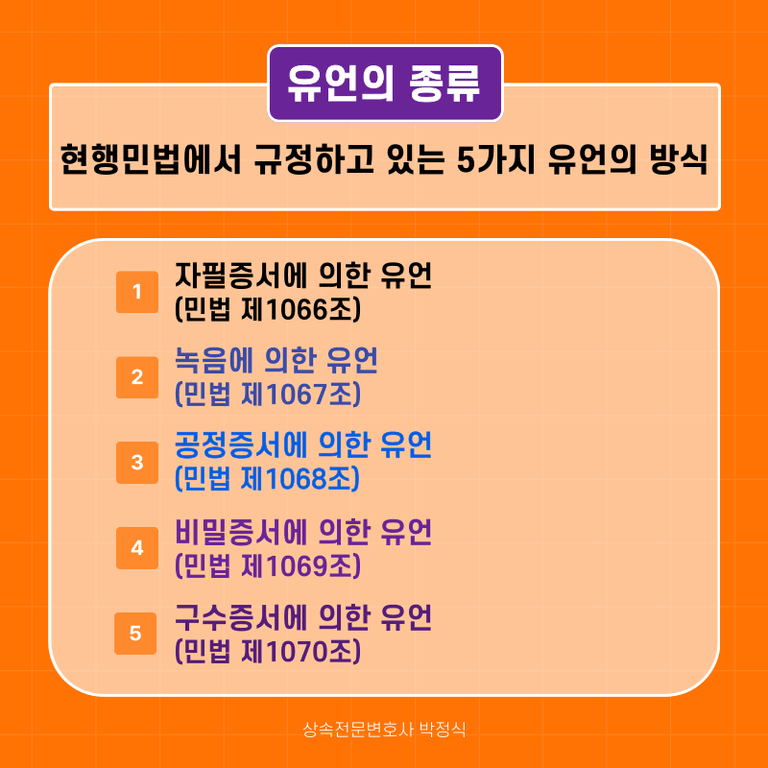 위와 같이 현행 민법에서 인정하고 있는 유언은 ① 자필증서에 의한 유언과 ② 비밀증서에 의한 유언, ③ 녹음에 의한 유언, ④ 공정증서에 의한 유언, ⑤구수증서에 의한 유언 등 5가지가 있습니다.