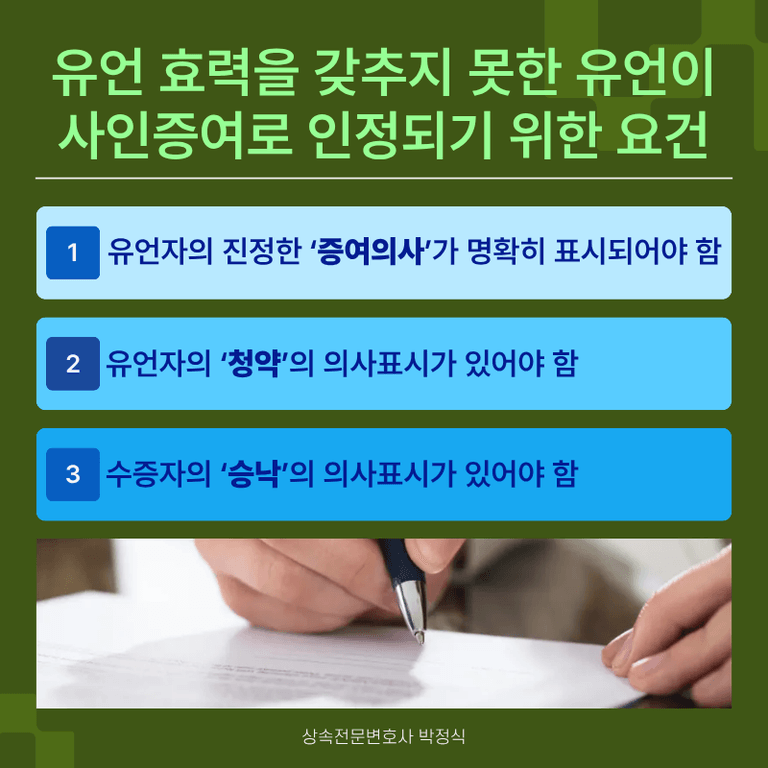 이러한 유언으로서의 효력이 없는 유언서가 사인증여로 인정받기 위한 요건을 구체적으로 살펴보면,