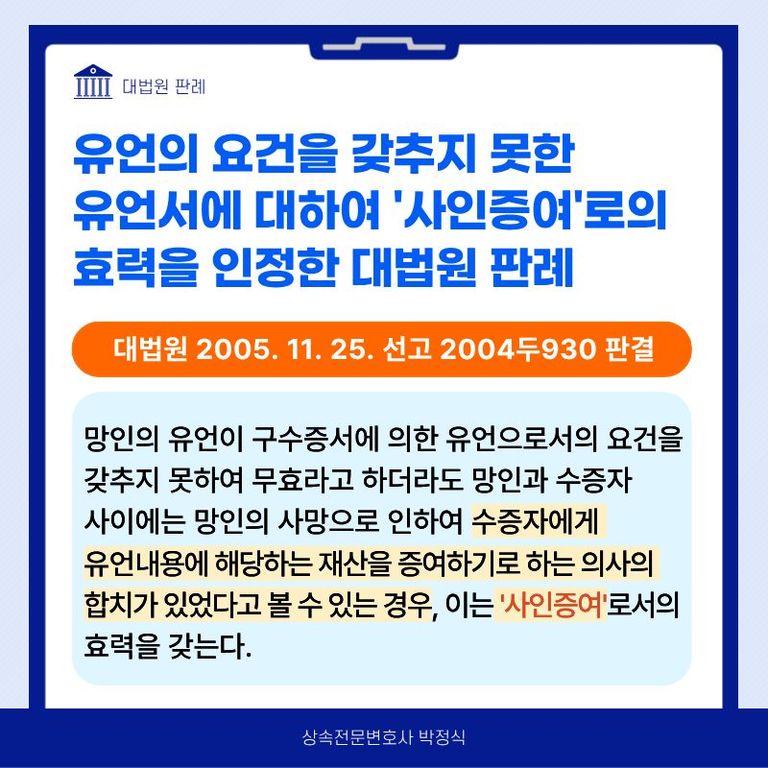 다만, 유언의 효력 요건을 갖추지 못한 유언이 사인증여로 인정되기 위해서는 망인이 작성한 유언이 망인의 진정한 의사에 부합하여야 하고, 망인과 수증자 사이에 사인증여에 대한 ‘청약’과 ‘승낙’의 명확한 의사합치가 있어야만 사인증여로 인정할 수 있는 것입니다.