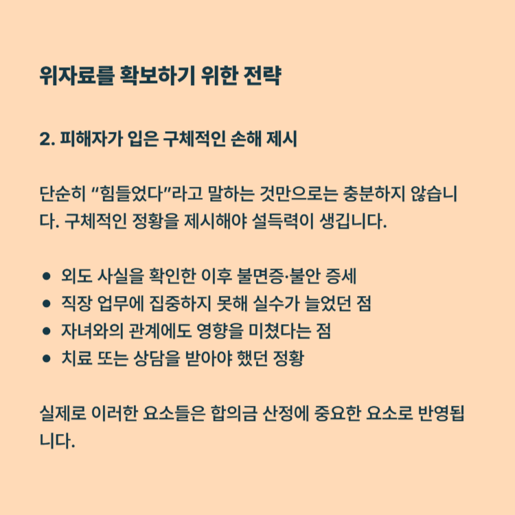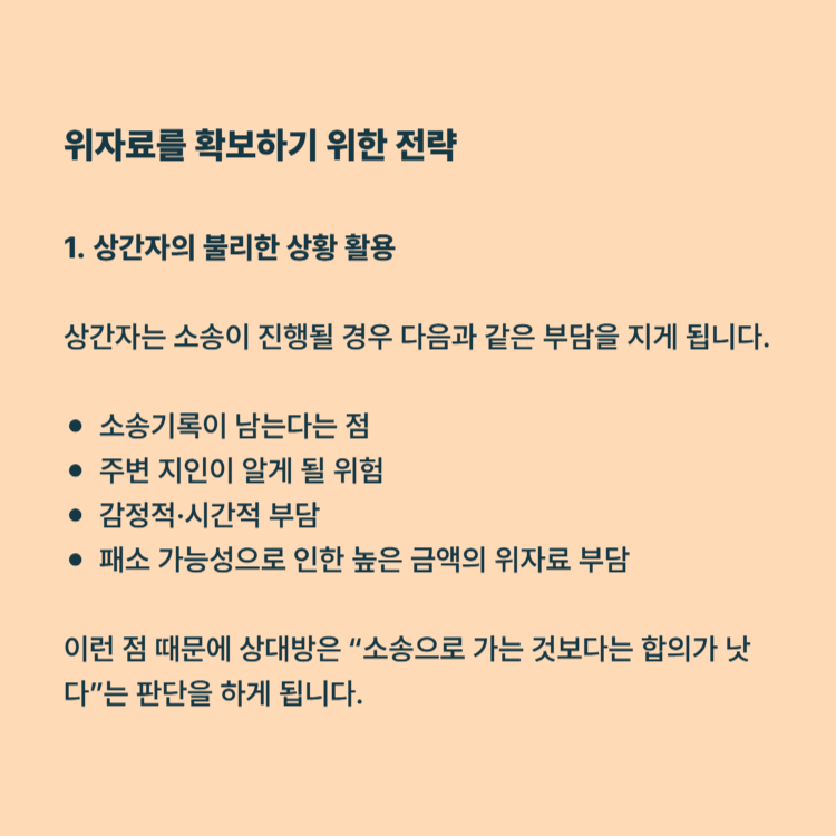 이 점을 세밀하게 안내하면 상대방이 “소송으로 가는 것보다는 합의가 낫다”는 판단을 하게 되고, 이를 통해 현실적이면서도 충분한 금액을 이끌어낼 수 있습니다.