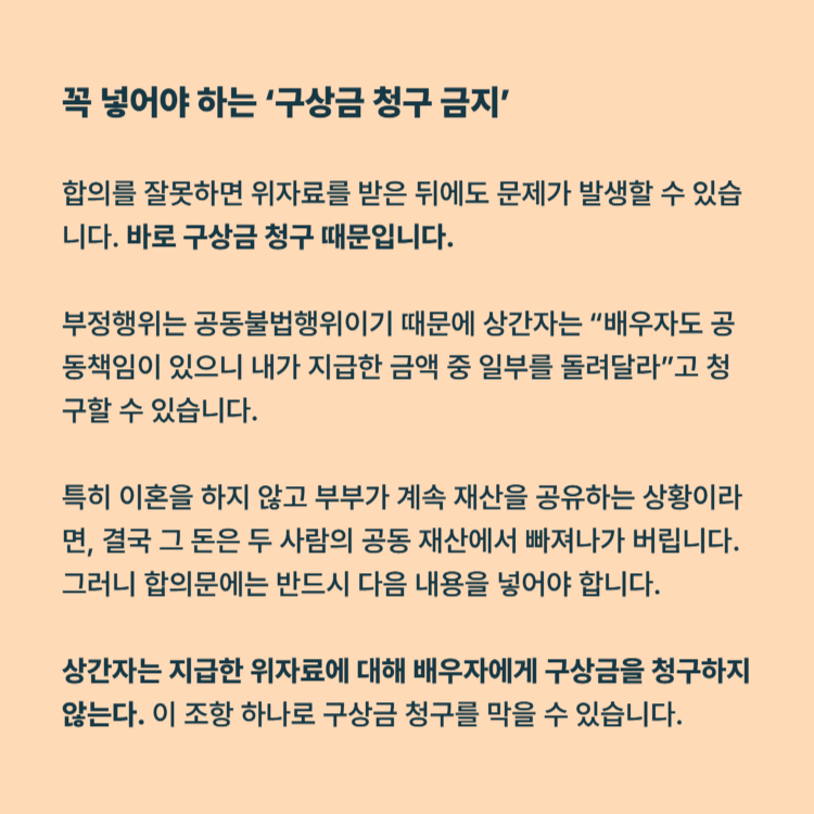 부정행위는 공동불법행위이기 때문에 상간자는 “배우자도 공동책임이 있으니 내가 지급한 금액 중 일부를 돌려달라”고 청구할 수 있습니다. 특히 이혼을 하지 않고 부부가 계속 재산을 공유하는 상황이라면, 결국 그 돈은 두 사람의 공동 재산에서 빠져나가 버립니다. 그러니 합의문에는 반드시 다음 내용을 넣어야 합니다.