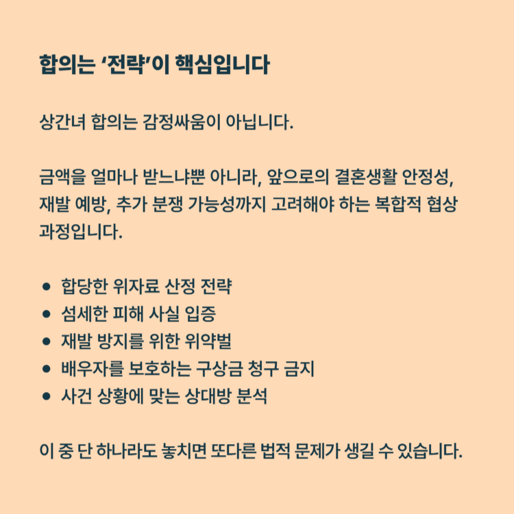 상간녀 합의는 감정싸움이 아닙니다. 금액을 얼마나 받느냐뿐 아니라, 앞으로의 결혼생활 안정성, 재발 예방, 추가 분쟁 가능성까지 고려해야 하는 복합적 협상 과정입니다.