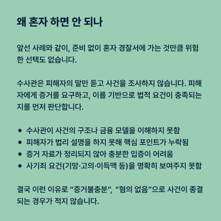 사기 피해를 당한 순간 가장 먼저 떠오르는 생각은 “일단 경찰서를 가서 신고해야겠다”일 것입니다. 하지만 앞선 사례처럼, 준비 없이 혼자 경찰서에 가는 것만큼 위험한 선택도 없습니다.