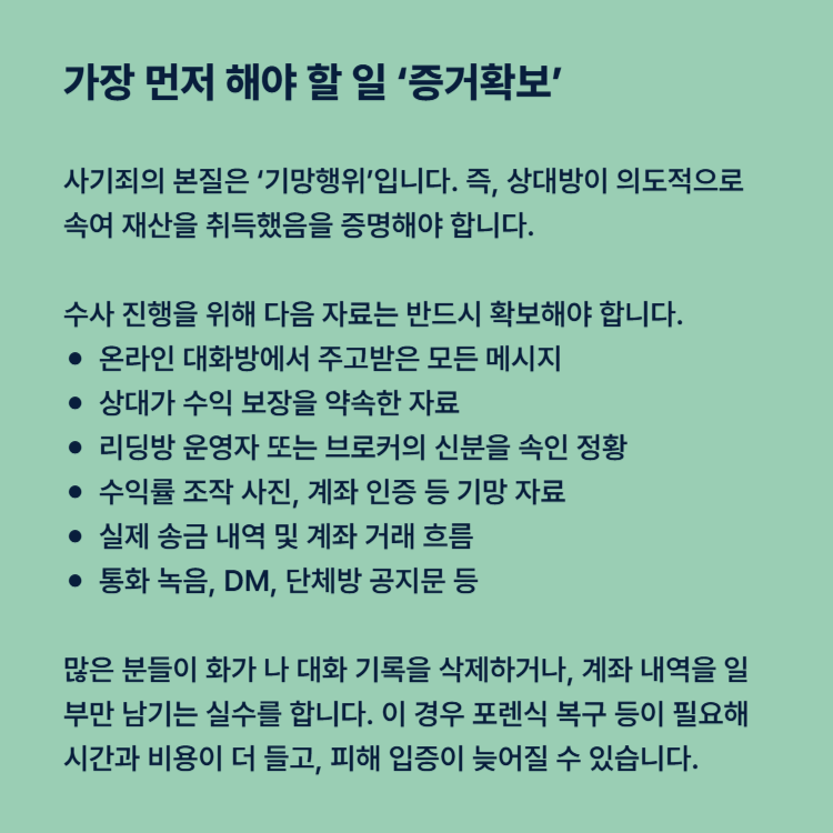 특히 많은 분들이 분노에 휩싸여 대화 기록을 삭제하거나, 계좌 내역을 일부만 남기는 실수를 합니다. 이 경우 포렌식으로 복구해야 하므로 시간과 비용이 더 들고, 피해 입증이 늦어질 수 있습니다.