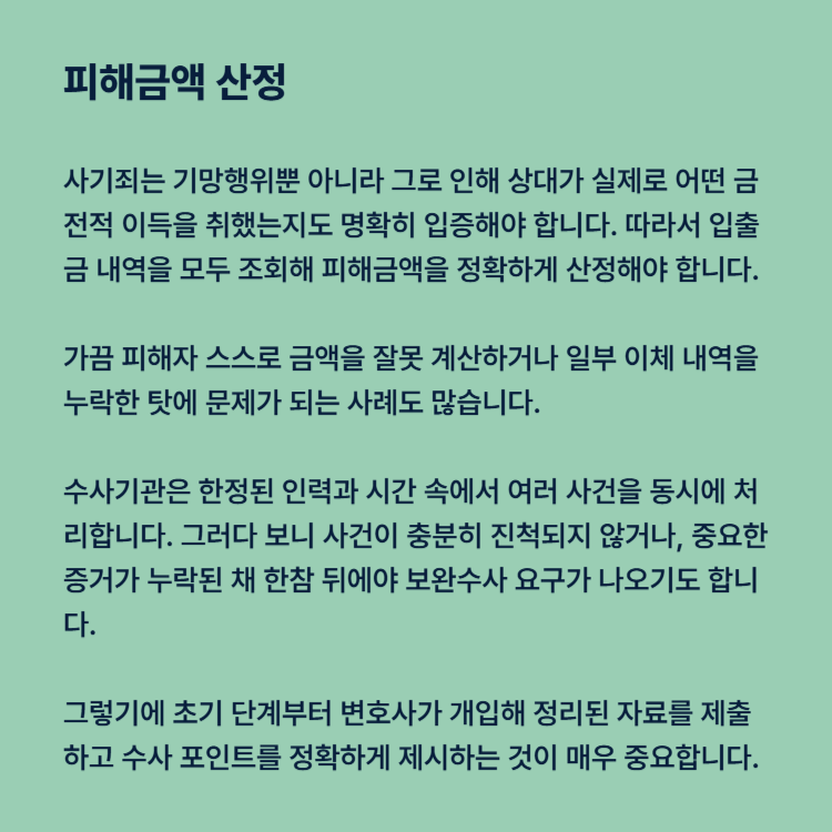 사기죄는 기망행위뿐 아니라 그로 인해 상대가 실제로 어떤 금전적 이득을 취했는지도 명확히 입증해야 합니다. 따라서 입출금 내역을 모두 조회해 피해금액을 정확하게 산정해야 합니다.