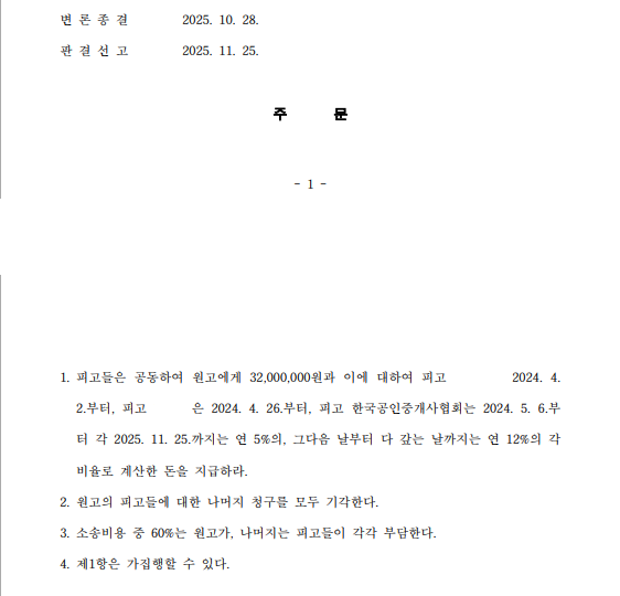 다만, 다만, 임차인 또한 거액의 보증금 계약을 체결하면서 스스로 권리관계를 면밀히 확인하지 않은 과실이 있다고 보아 중개사의 책임을 20%로 제한, 3,200만 원 및 지연손해금을 지급하라고 판결했습니다.